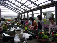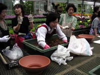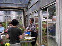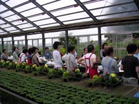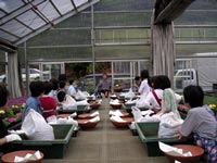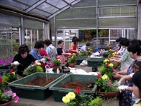 | 参加者23名 生憎の雨模様の天候でしたが、温室の中は初夏の花々が咲き乱れていました。 石井さんのお話に皆さん熱心に耳を傾けた後は、土と格闘しつつも、素敵な寄せ植えが完成しました。 |