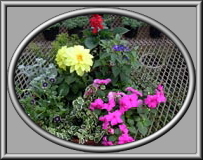 | 配置決め。 鉢の正面を決めて、背の高い花を後ろに。手前は低く。鉢の際まで四隅に配置する。 |