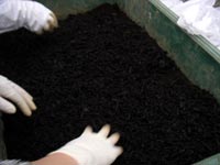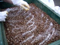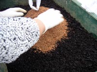 層になった材料を腕を使って、ざっくりと混ぜ合わせる。 土の出来上がりです。 |