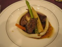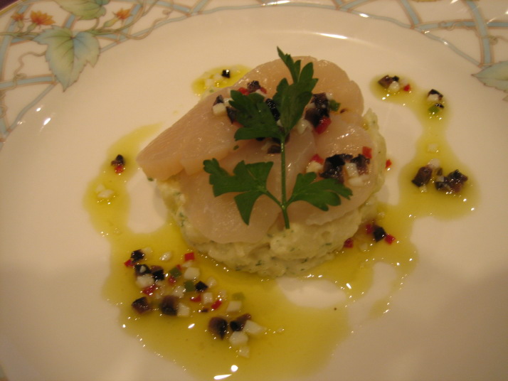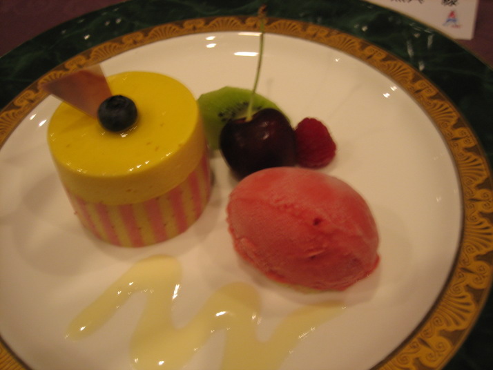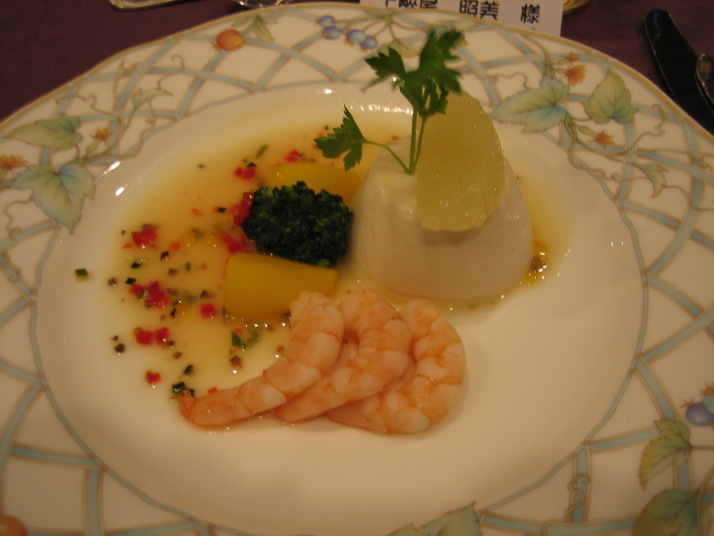・帆立貝とジャガイモのケーキ仕立て ・冷製コンソメ とうもろこしのクリーム3色スープ ・海の幸のドーム作り グレープフルーツと野菜のソース ・キールロワイヤルのシャーベット ・牛ロース肉のエリンギ茸包みと なすの詰め物 バジルソース風味ソース ・パッションフルーツとチョコレートのムース フランボワーズシャーベット |