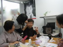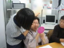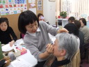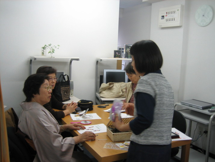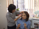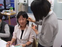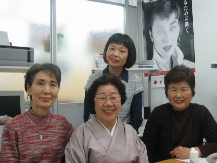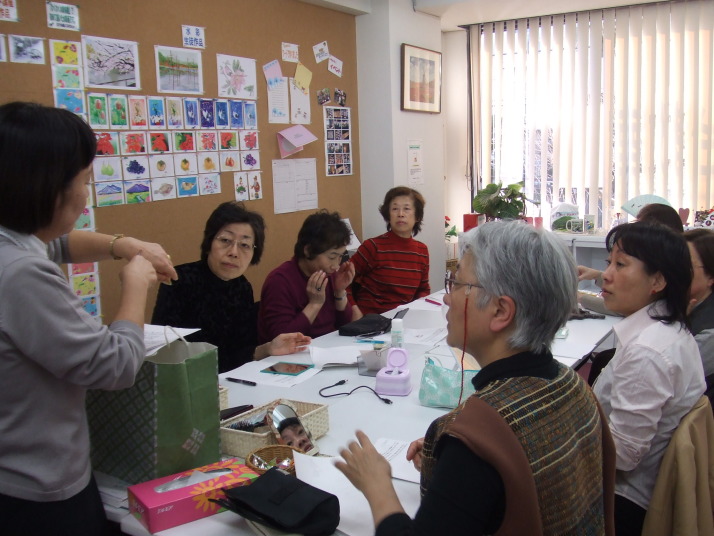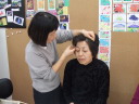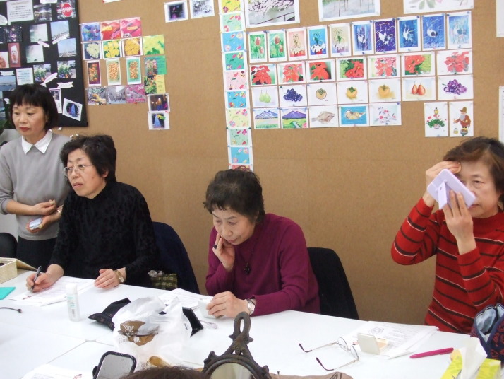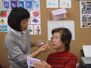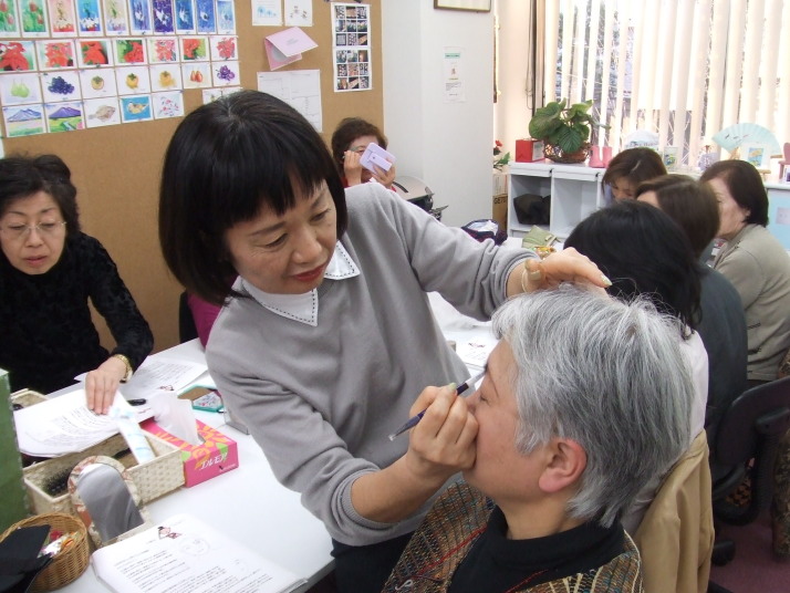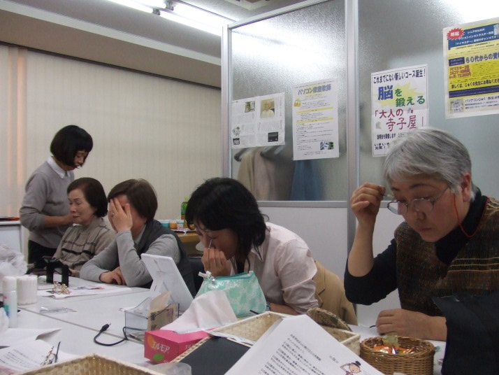 いつものお教室モードでおしゃべりをしながら和気あいあいと進められました。まずはみ〜なですっぴんになり、眉のカットからです。はじめは眉カットバサミを手にしてどう使うかおっかなびっくりでしたが、慣れてくれば「これって快感!くせになりそー」(Sチューター)と、スッキリくっきりの眉が出来上がりました。そしてベースメイクのファンデーションから始まり、整えた眉を眉山から眉尻へ、そして眉頭から眉山につなげて眉の完成です。続けてアイメイクのアイシャドーを入れ、目もとが明るくなったところでメリハリの立体感をつけるチーク(頬紅)をつけ、最後にリップ(口紅)で総仕上げです。