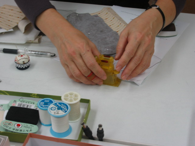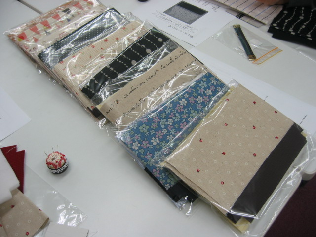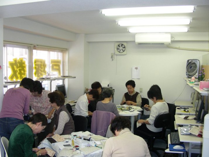 | どの生地にしようか迷ってしまいます。 | 末広先生の説明で始まりました。 | お教室は「シ〜ン」として、黙々と縫っています。。 | でも、時々は皆さんとの会話も楽しいですね!。 |