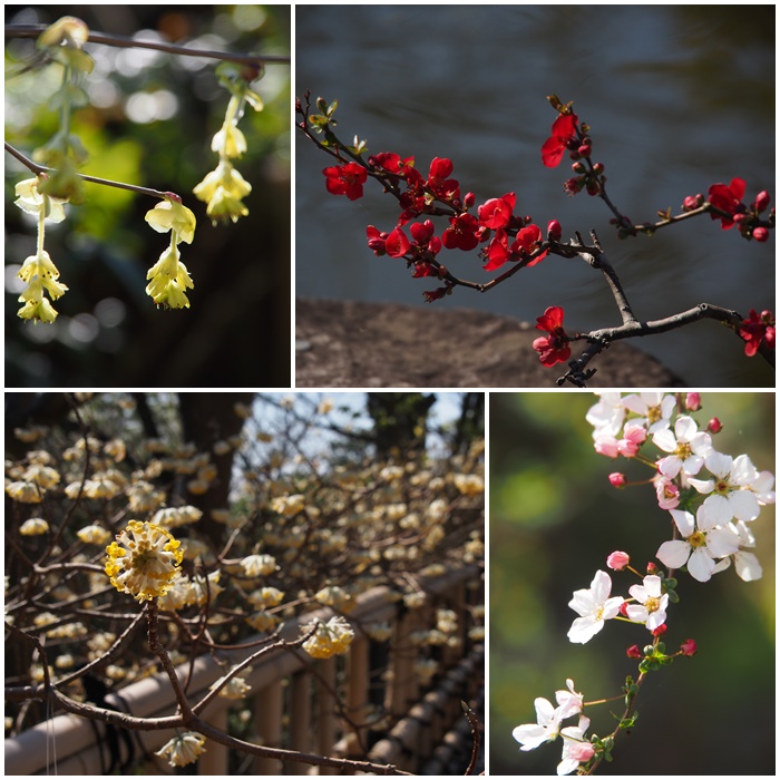 寒緋桜やミツマタ、コブシ、ボケ、白モクレン等が咲いていて、