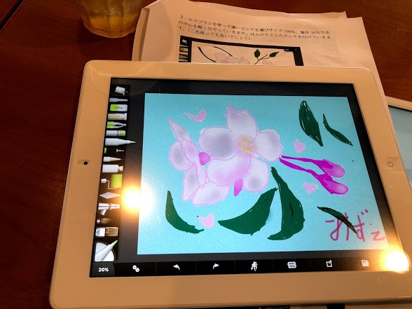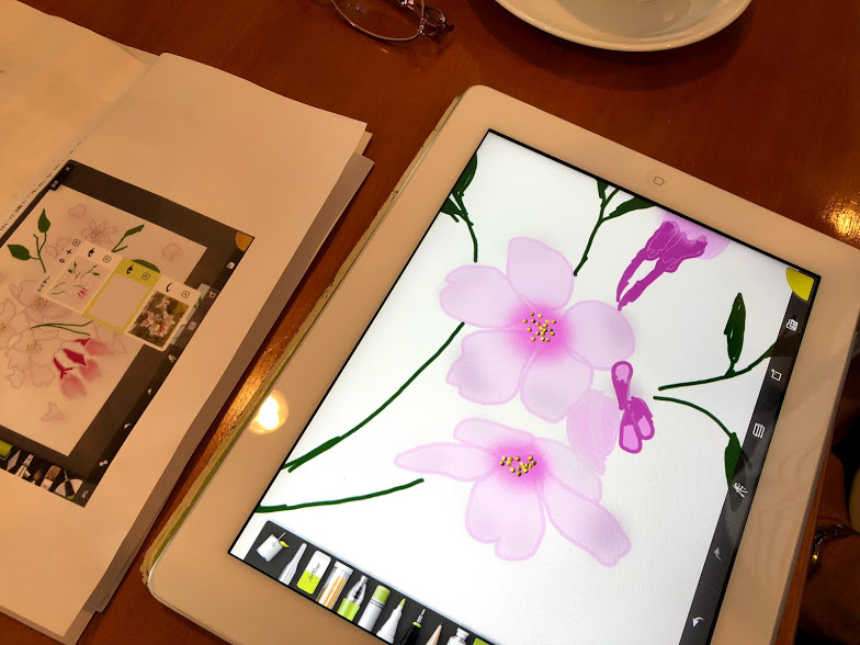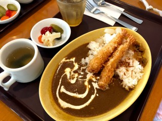 ゆっくりお花見をしたい気分でしたが簡単な描き方の注意点をレクチャー後、予約していたレストランで昼食です。今日のランチは「エビカレー」でした。