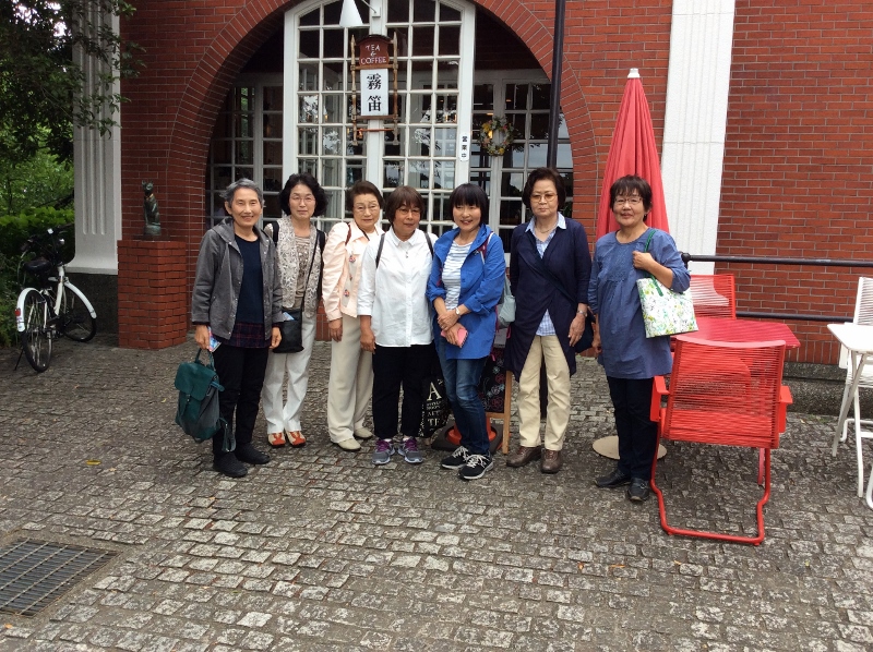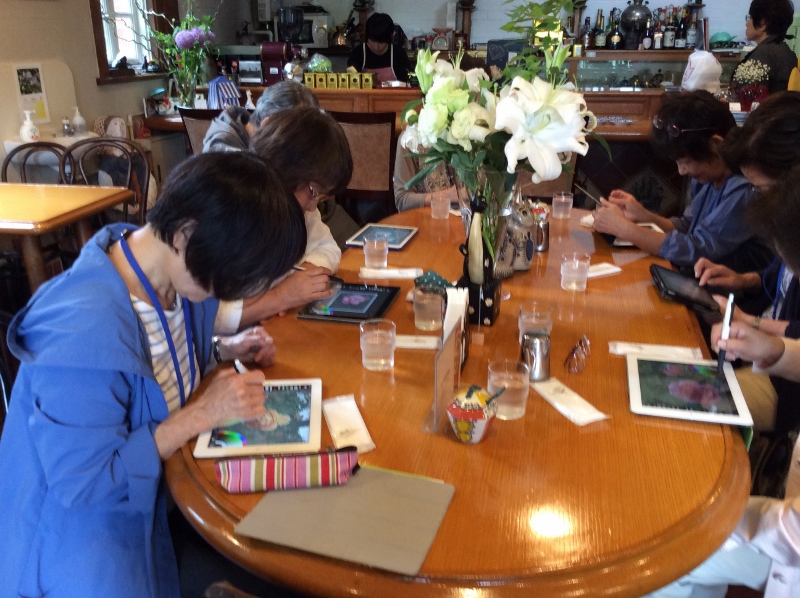 そのあと予約してあったカフェ「霧笛」に移動してこれもピクニックではお愉しみのランチタイムです。自家製サンドイッチとおコーヒーで一息つきました。(うっかりーすっかり食べてから写真を撮るのを忘れた~と気づくが、、、)ランチ後はこちらのカフェですぐさま色付けをレクチャーし、下絵で描いた薔薇に色を付けていきます。