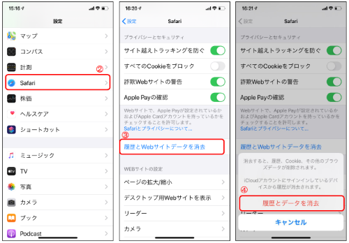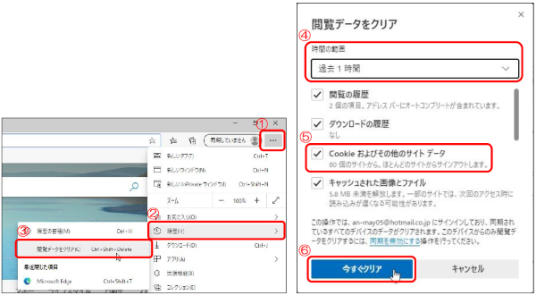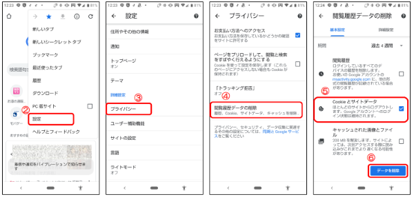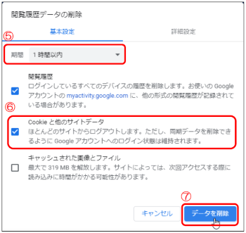 ⑤【Cookieおよびその他のサイトデータ】にチェックが入っていることを確認