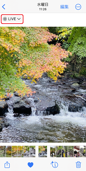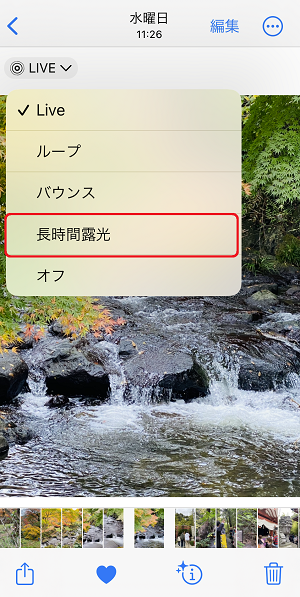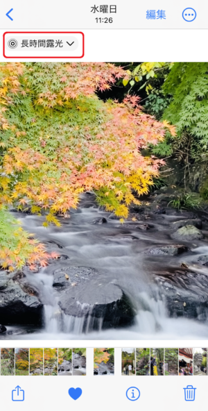 HOME > サポート通信 > スマホの撮影ワザ②長時間露光 スマホの撮影ワザ②長時間露光 第2回は、長時間露光のお話です。 昨年のバスピクニックで訪れた「熱海梅園」。 園内には小川が流れています。 スマホでも水が流れるような写真を撮れるんですよ。 ① iPhoneカメラの「LIVE」をオンにして、撮影します。 ② 写真アプリで、撮影した写真を開きます。 ④ 【LIVE】をタップして、【長時間露光】をタップします。 ⑤ ほら!こんな感じになりました。 簡単なので、ぜひ試してみてくださいね。 こんな楽しみ方も! (柴田)