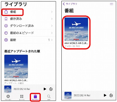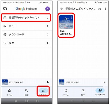 ④ 【ライブラリ】をタップし、【登録済みのポッドキャスト】をタップします。