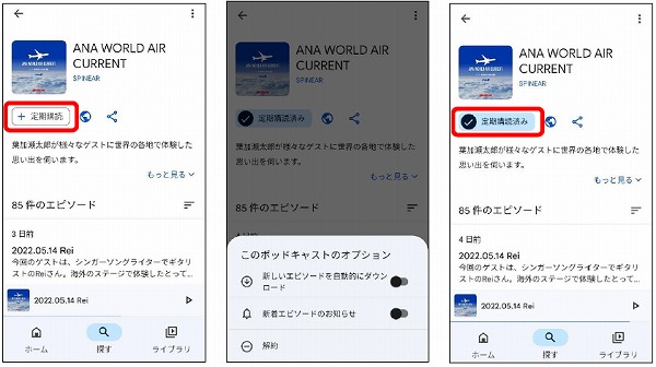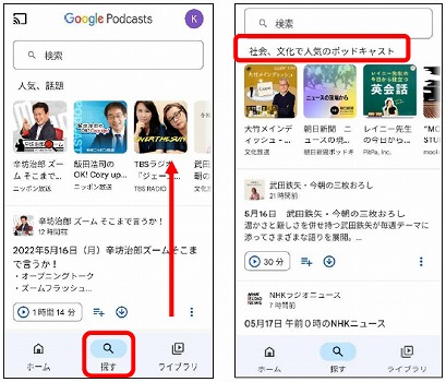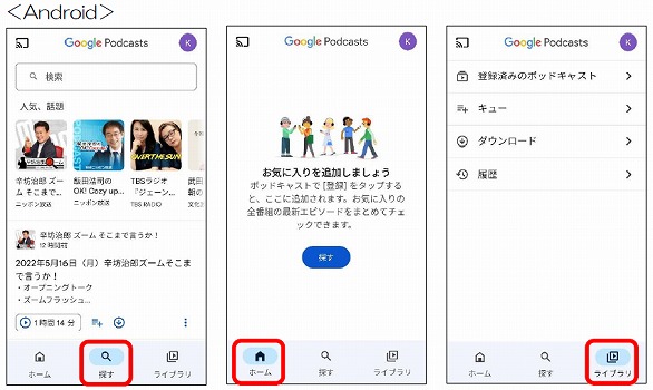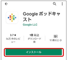 Androidは、Playストアで「ポッド」と入力し、Googleポッドキャストをインストールします。