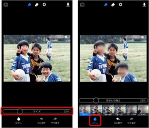 ③ ぼかしのサイズを調整して、指でぼかしたい箇所をなぞります。
