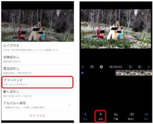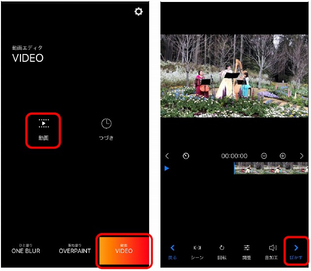 ① 【VIDEO】に切り替え、【動画】をタップして、加工したい動画を選びます。